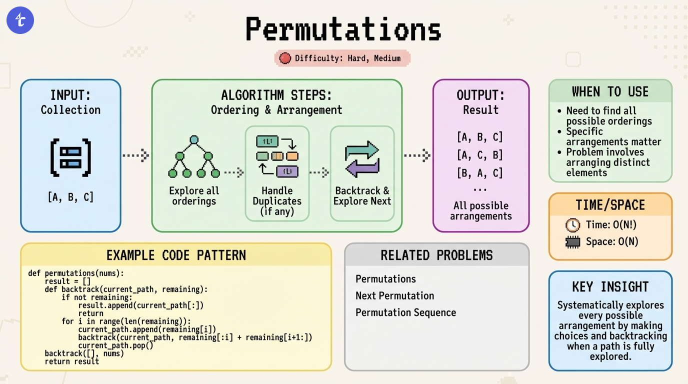 visited array) are needed.The Backtracking - Permutations pattern is fundamental and appears in several variations:
